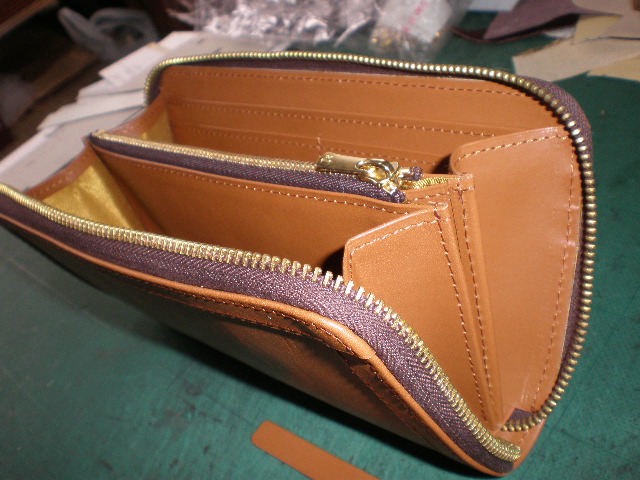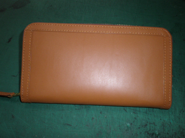 何とかラウンド札入れが仕立てあがりました。表周りにふち革をつけヘリを補強して